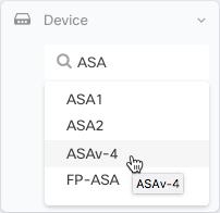 Filter the network policies list by device by expanding the Device filter, entering the name or IP address in the Search devices field, and then selecting a device found in the result.