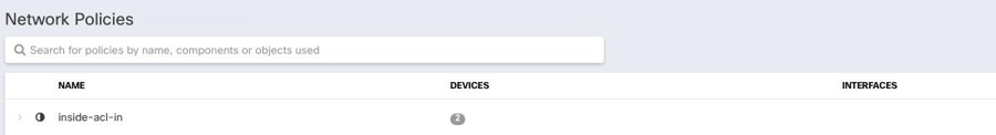 Shared policies are policies that are found on more than one device. Changes that are made to a shared policy impact all devices where that policy is found. In the example below, the inside-acl-in policy is shared by two devices. See Shared ASA Network Policies for more information.