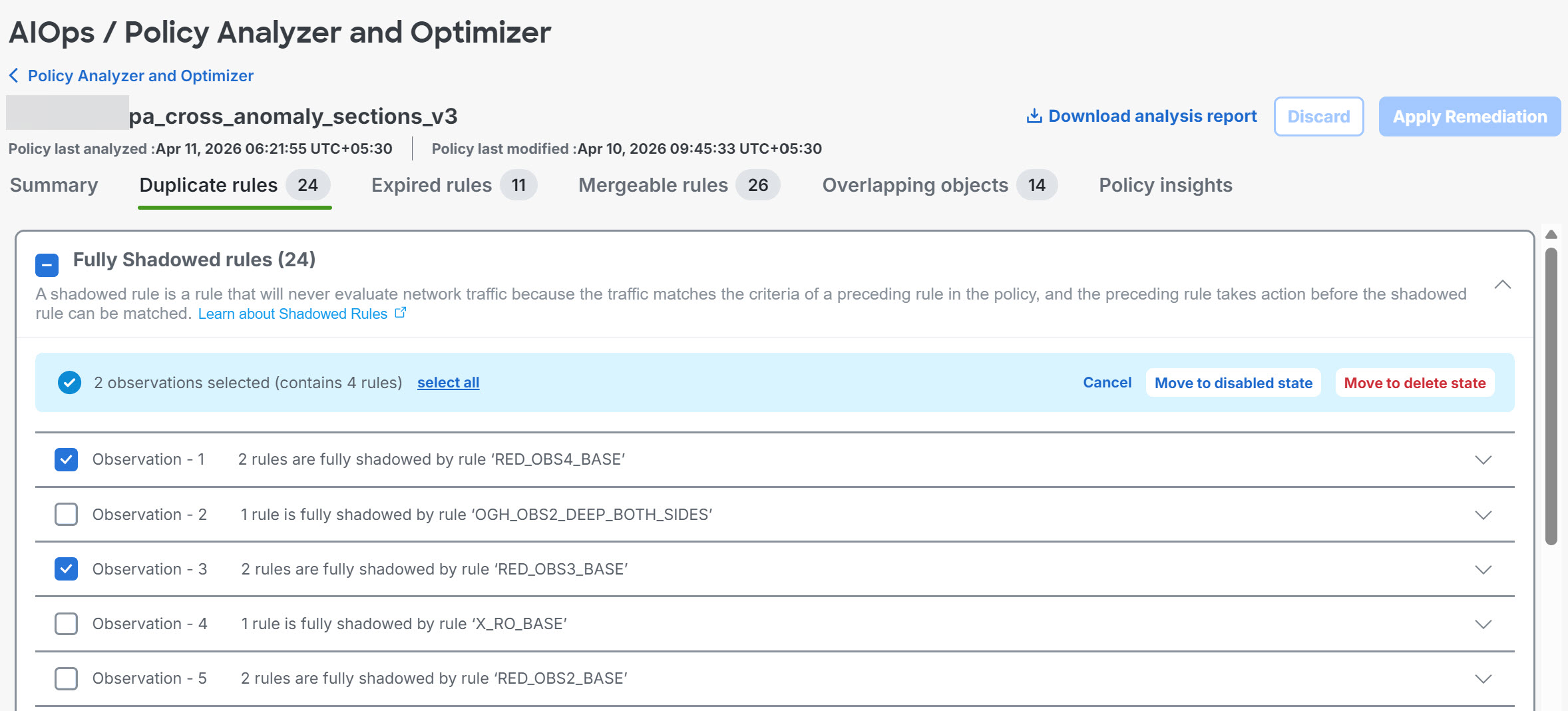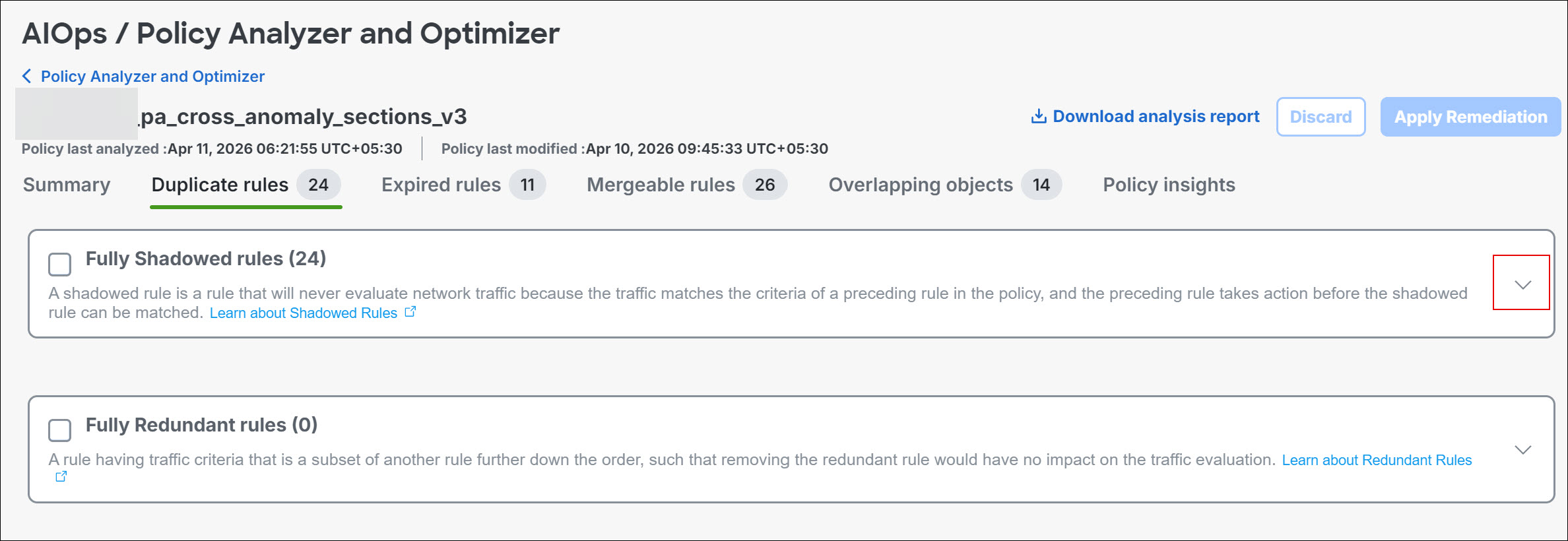 Step 7 | Click Apply. After remediation is complete, the selected rules will be updated. The updated policies are automatically analyzed to generate a new summary and highlight any remaining issues. | ||