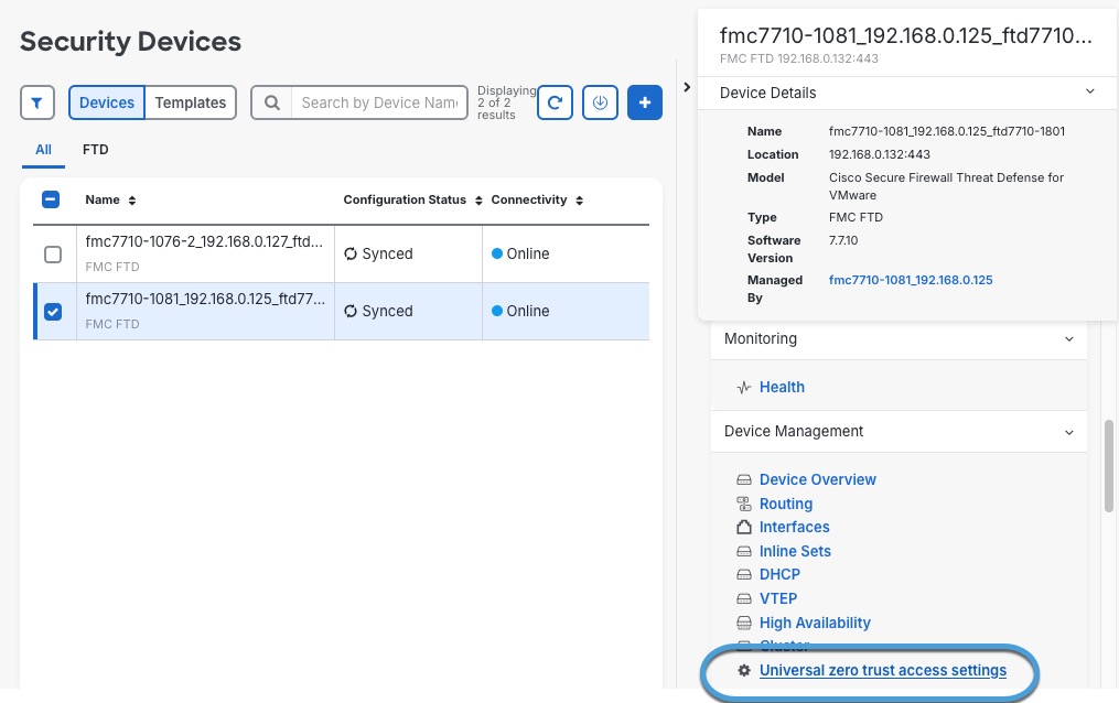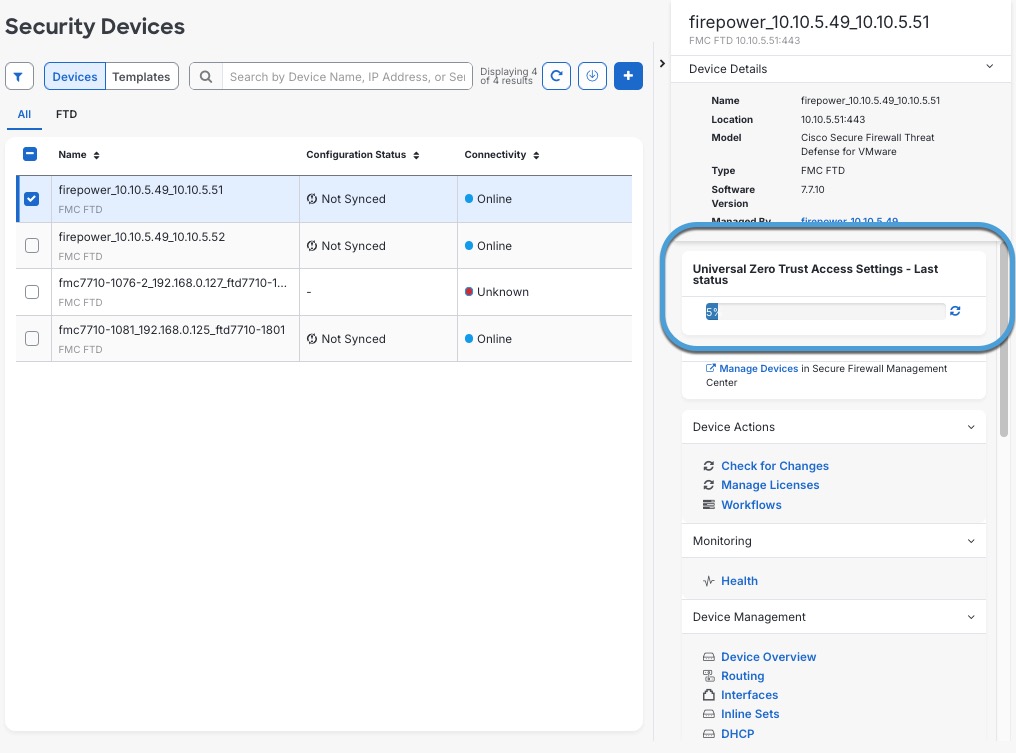 On the Security Devices page, select the check box next to the device to which you just deployed the Universal ZTNA configuration.