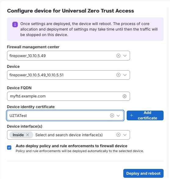 On the device, the Auto deploy feature selectively deploys only the Universal ZTNA access policy. It does not impact other changes or configurations on the Firewall Management Center.